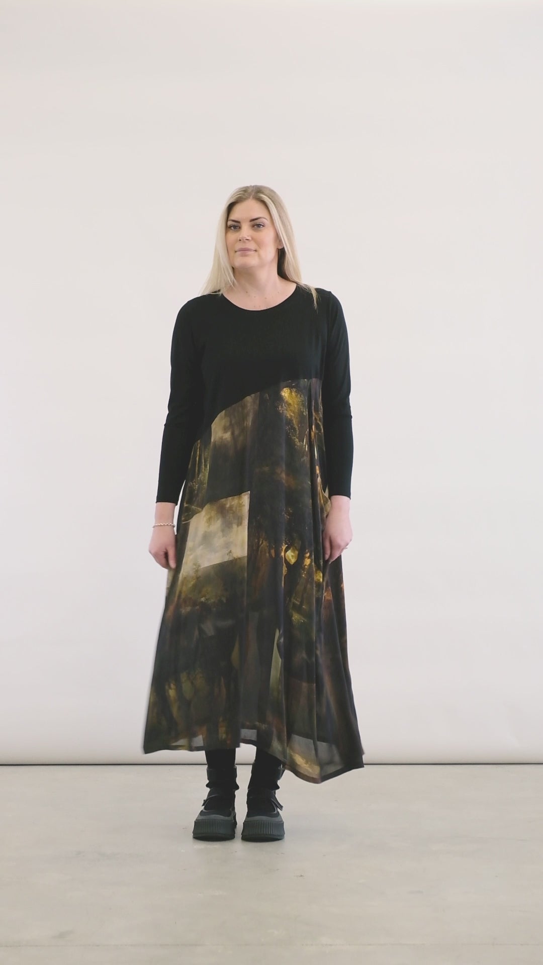 This is a softly structured women’s dress designed with a relaxed silhouette and clean, architectural lines. Featuring a simple bodice with gentle shaping and a fluid skirt, the Observe Dress allows the Midnight Trek print to take center stage, with subtle horses appearing through the lower hem like movement in the distance. An original artwork designed by Deeanne Hobbs.